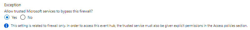 To overcome this limitation a few tweaks to the architecture need to be made, which are presented in the following sections of this document. We introduce an Azure Event Hubs in the architecture with public access disabled but “allow trusted microsoft service to bypass” setting enabled.