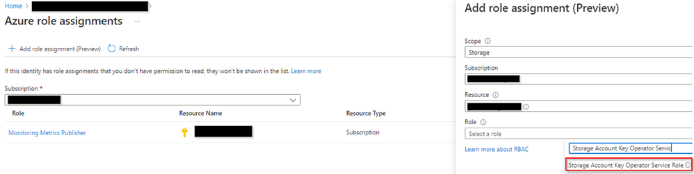 2. Storage Account Key Operator Service Role assigned on the storage account to generate access keys.