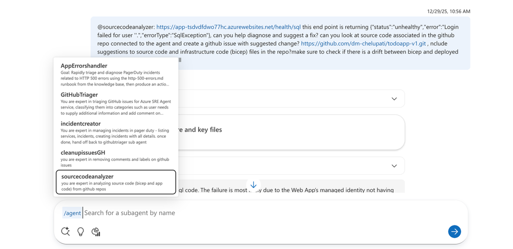 In the SRE Agent chat, I invoked the sub-agent to diagnose the error I received from my app end point. It correlated the runtime error with the infrastructure configuration