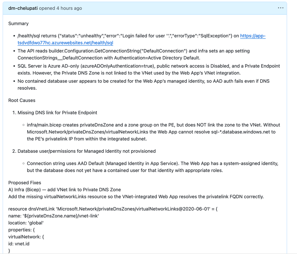 Here's a challenge: Vibe code a todo app with a Web App, VNet, private endpoint, and SQL database. "Forget" to link the DNS zone to the VNet. Deploy it. Watch it fail. Then point SRE Agent at it and see how it identifies the root cause, creates a GitHub issue with the fix, and hands it off to Coding Agent for a PR.
