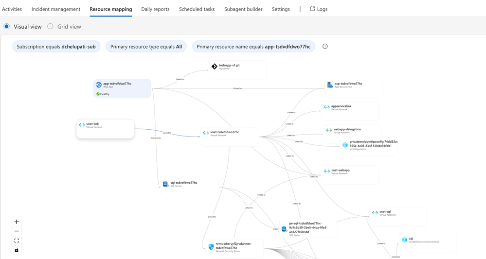 I created an SRE Agent with read access to my Azure subscription. You can scope it to specific resource groups. The agent builds a knowledge graph of your resources and their dependencies visible in the Resource Mapping view below.