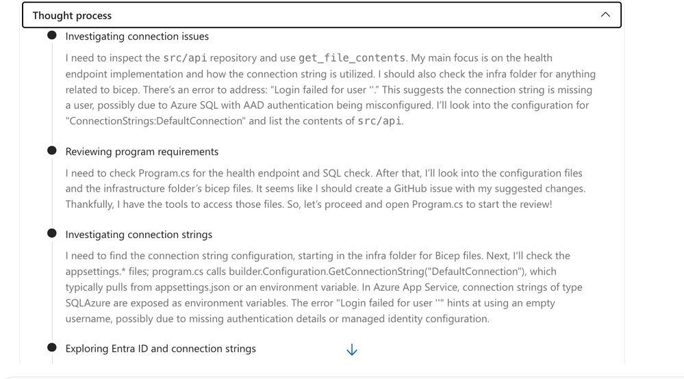 SRE Agent analyzed the error by tracing code in Program.cs, Bicep configurations, and Azure resource relationships Web App, SQL Server, VNet, private endpoint, DNS zone, and managed identity. Its reasoning process worked through each layer, eliminating possibilities one by one until it identified the root causes.