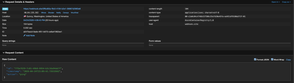 Create an ACR push webhook that only fires for push events on the specific repository you'll use for testing. When tags and digests are copied asynchronously into a downstream ACR during artifact cache operations, they are classified as push events on the downstream ACR. As such, the push webhook should fire for these operations, making push webhooks a useful way to observe and validate cache-driven push behavior in the registry. Scoping the webhook to push events also eliminates noise from other registry activity during this experiment.