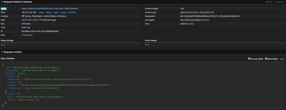 We confirmed the webhook results by listing what ACR actually stored: