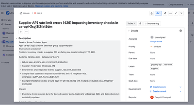 @JiraGrafanaexpert: My container app ca-api-3syj3i2fat5dm in resource group rg-groceryapp is experiencing rate limit errors from a supplier API when checking product inventory.