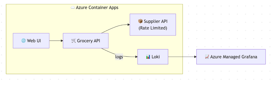 The app runs on Azure Container Apps with Loki for logs and Azure Managed Grafana for visualization.