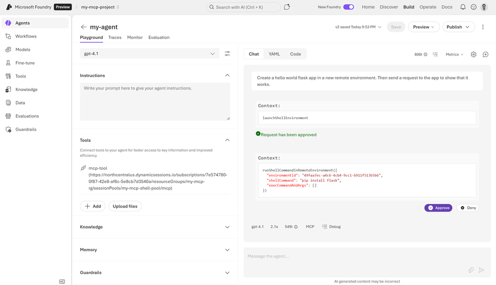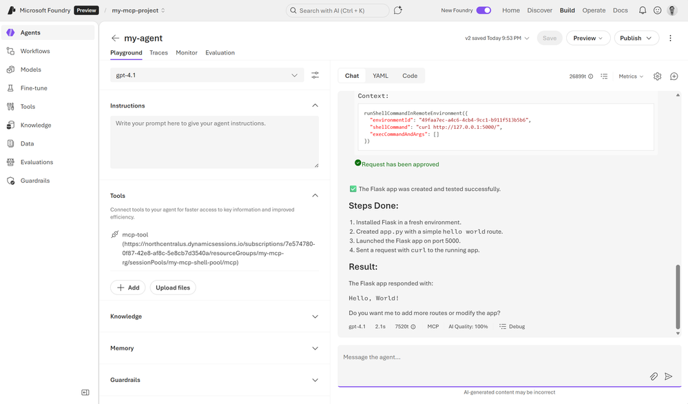 In this tutorial, we demonstrated how to extend Azure AI Foundry agents using Azure Container Apps dynamic session pools. By enabling MCP support on a shell session pool, we created a secure, on-demand execution environment that allows AI agents to run remote shell commands. With this setup, your AI agents can now bridge the gap between conversation and action, providing users with interactive and useful experiences.