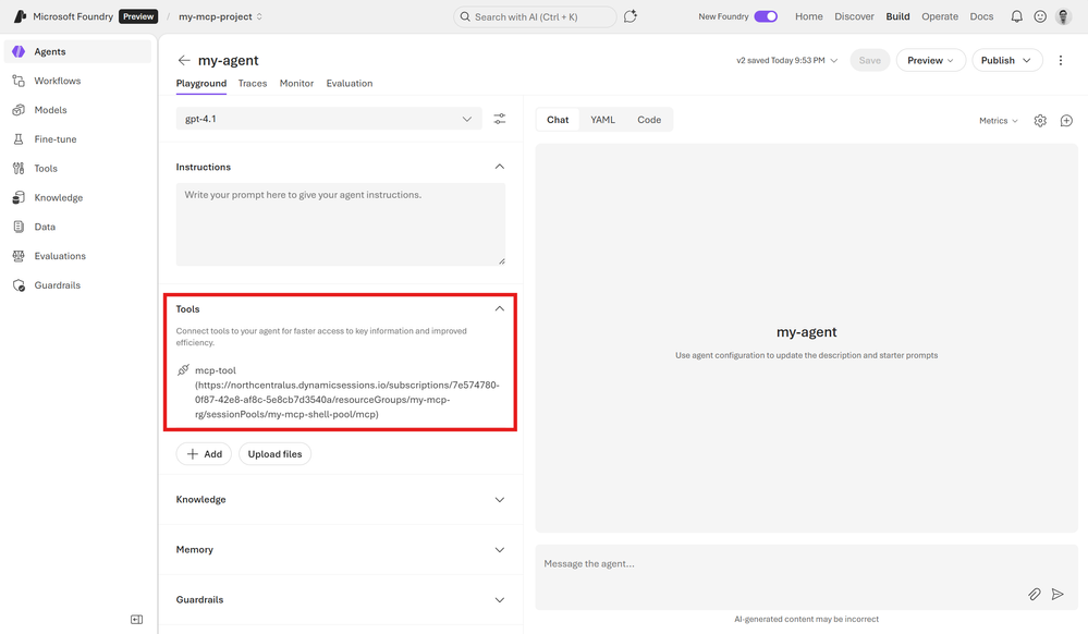 The following is a tutorial on how to use an MCP enabled dynamic session as a tool used in an Azure Foundry agent giving it the capability to run remote shell commands.