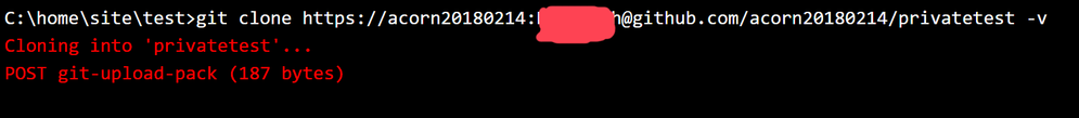 In azure app service Kudu console, it is easy to clone a public git repository using "git clone" command, when it comes to private repository, you may find the same "git clone" command is stuck at "Cloning" step and isn't working any more. This is simply because the repository is a private one and need to be authenticated, in the meanwhile, we need an non-interactive way since Kudu console doesn't support popped-out windows.