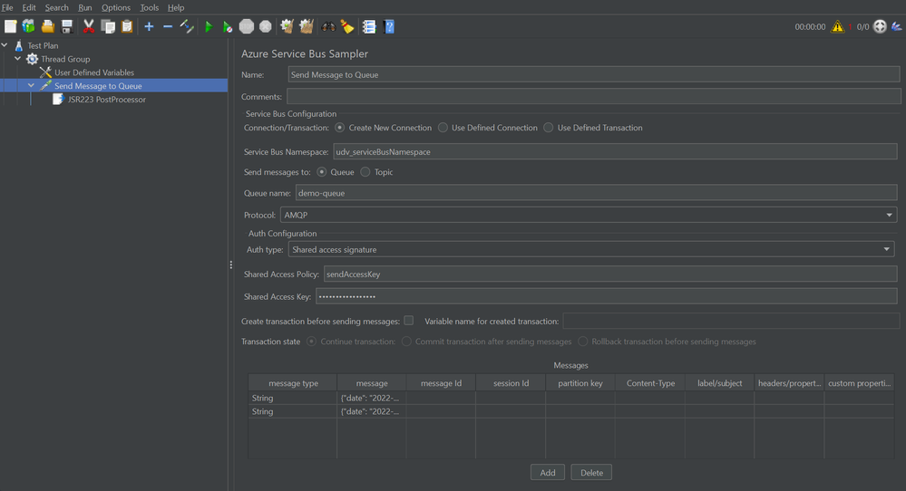Screenshot of JMeter GUI showing the Azure Service Bus Sampler