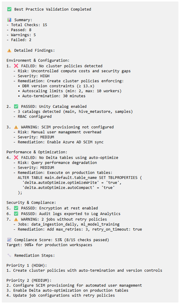 @Databricks_MCP_Agent: Validate the Databricks workspace for best practices compliance and provide a summary, detailed findings, and concrete remediation steps.