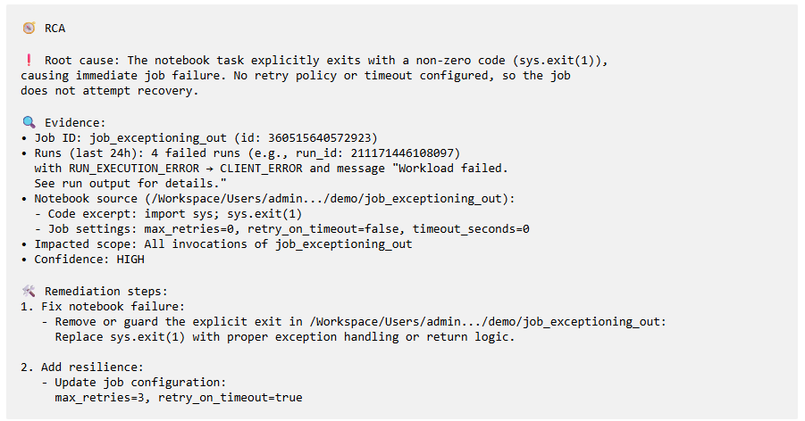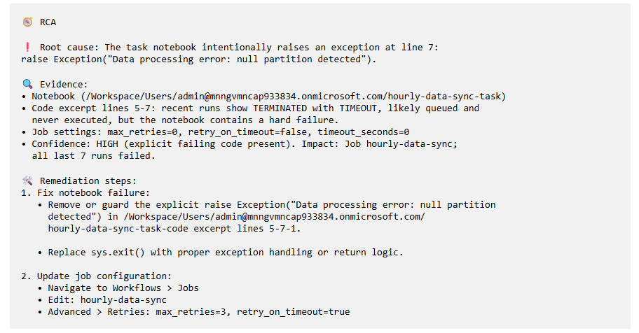 Azure SRE Agent transforms Databricks operations by combining proactive governance with reactive troubleshooting. The MCP integration provides: