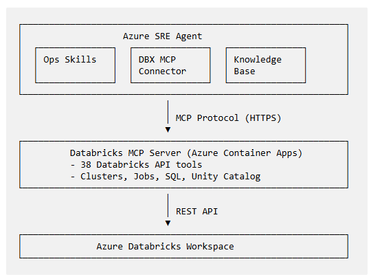 Azure SRE Agent integrates with Azure Databricks through the Model Context Protocol (MCP) to provide: