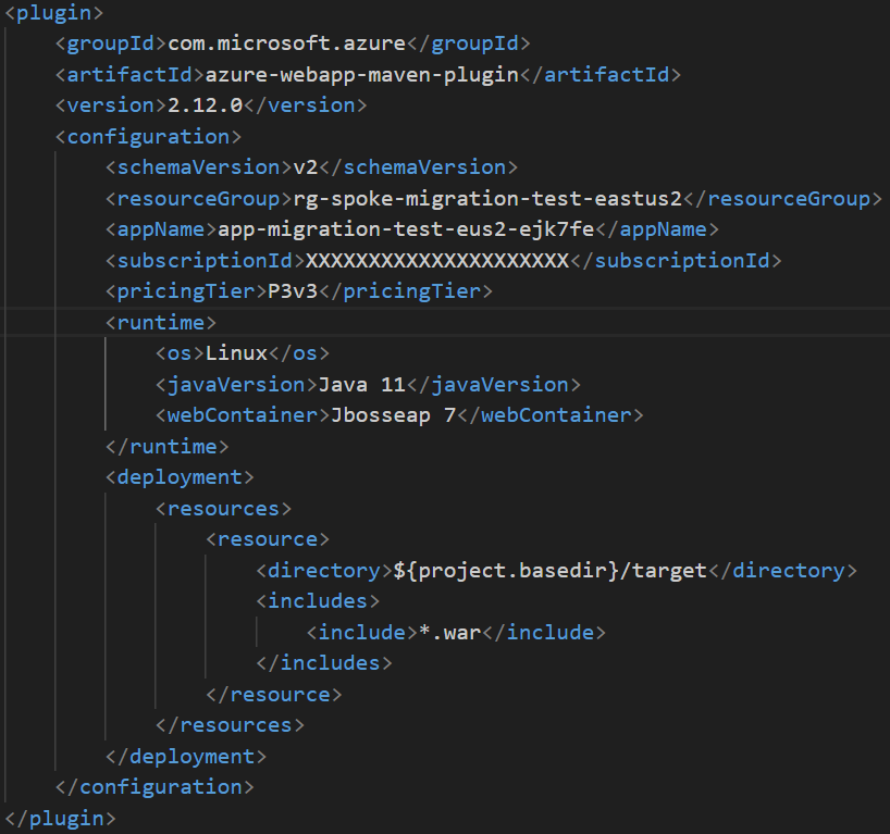 This will accelerate configuration of your deployment for App Service. You may be asked to authenticate and provide some information about your soon-to-be-deployed application including: OS type (Linux), Java version (Java 11), web container (JBOSS EAP 7), and pricing tier (P1V3). After making these selections, you'll need to modify your pom.xml file to specify your resource group and app name as shown below:
