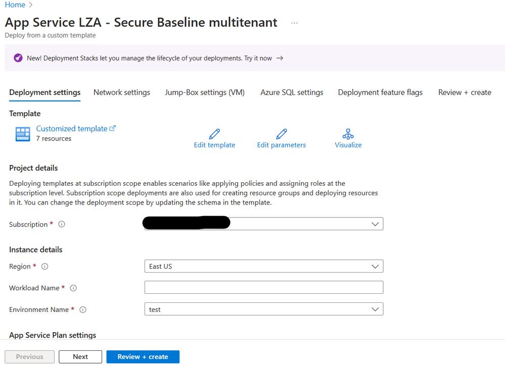 Being open source, this repo can always be forked and modified if you don't see the perfect template or configuration for your application or suite of applications targeted for migration to Azure App Service. For this example, we'll just use the provided Deploy to Azure button, which still allows for some configuration in a clearly defined, in-portal experience (shown below) for configuring the specifics of your enterprise environment. Note that there may be some cost associated with the resources created by Landing Zone Accelerator, depending on your selected options. This is intended for enterprise environment creation for applications "at-scale".