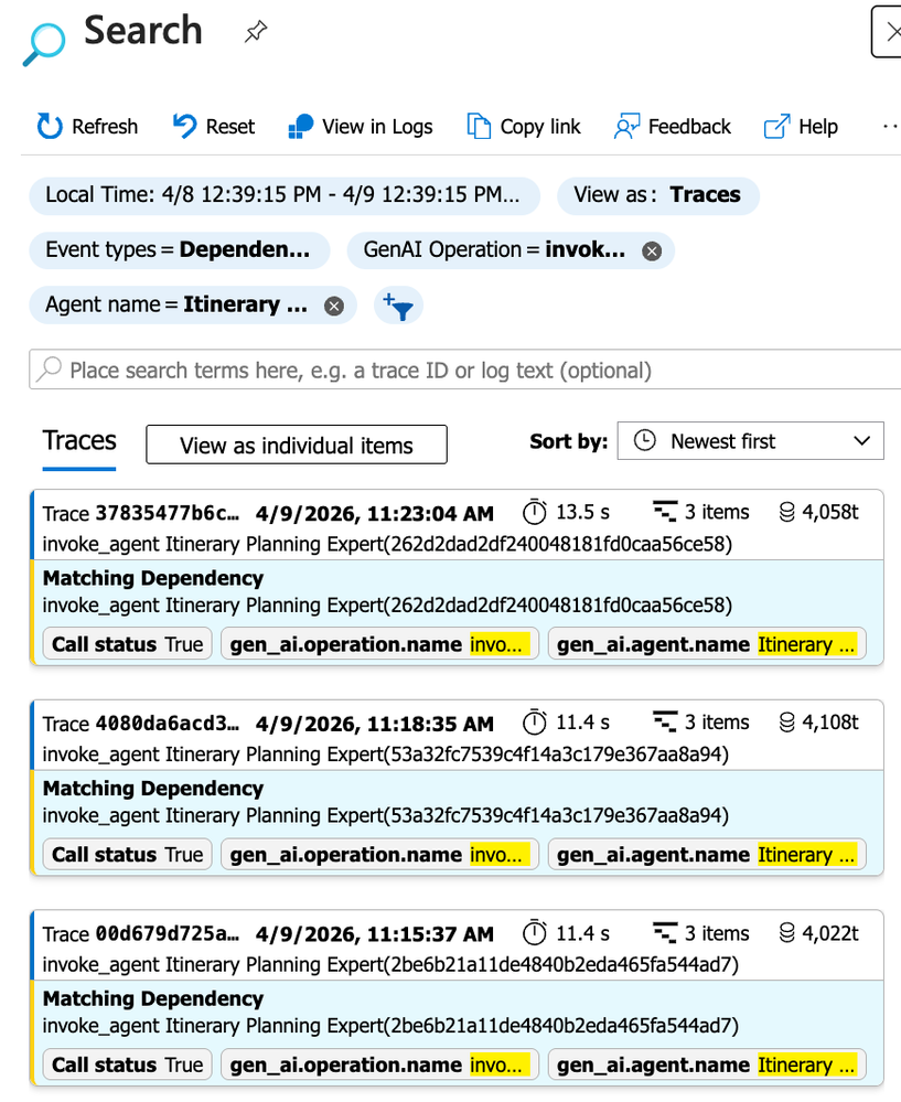 Once the application is deployed and processing travel plan requests, here's how to explore the agent telemetry in Application Insights.