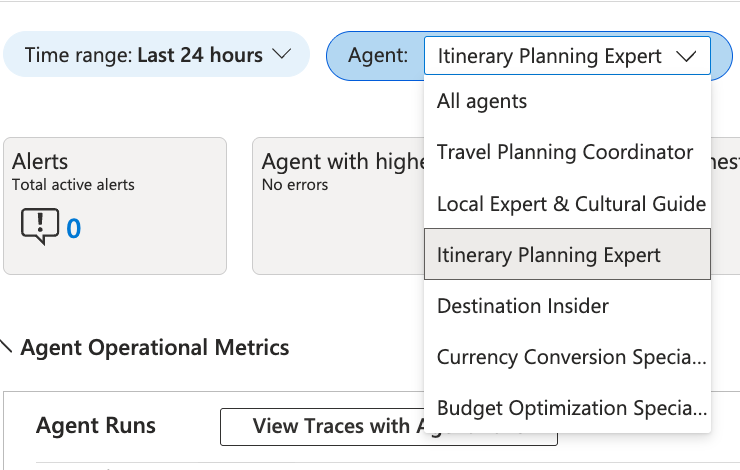 The agent dropdown at the top of the page is populated by the gen_ai.agent.name values in your telemetry. You'll see all six agents listed: