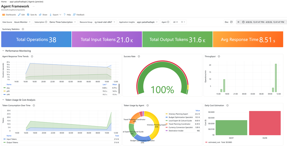 gen_ai.agent.namevalues from your telemetry. In our travel planner, this shows all six agents: "Travel Planning Coordinator", "Currency Conversion Specialist", "Weather & Packing Advisor", "Local Expert & Cultural Guide", "Itinerary Planning Expert", and "Budget Optimization Specialist". You can filter the entire dashboard to one agent or view them all. - Token usage metrics β Visualizations of input and output token consumption, broken down by agent. Instantly see which agents are the most expensive to run.