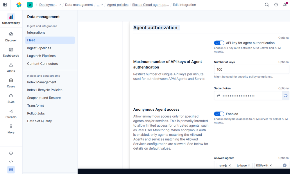 Still in the Elastic APM integration page, scroll to Agent authorization.