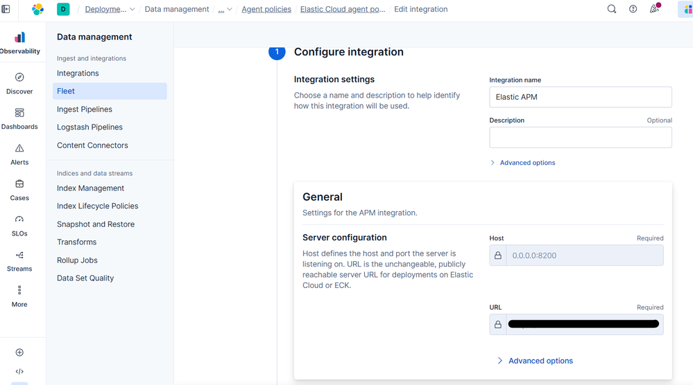 Observability → Data management → Fleet → Agent policies → Elastic Cloud agent policy → Elastic APM.