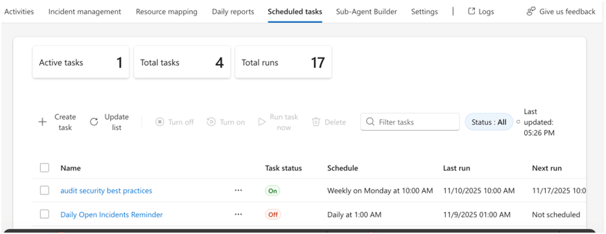 - Multi-Source Triggers: Go beyond chat-based interactions, and trigger the agent to automatically respond to Incident Management and Ticketing systems like PagerDuty and ServiceNow, Observability Alerting systems like Azure Monitor Alerts, or even on a cron-based schedule for proactive monitoring and best-practices checks. Additional trigger sources such as GitHub issues, Azure DevOps pipelines, email, etc. will be added over time. This means automation can start exactly when and where you need it.