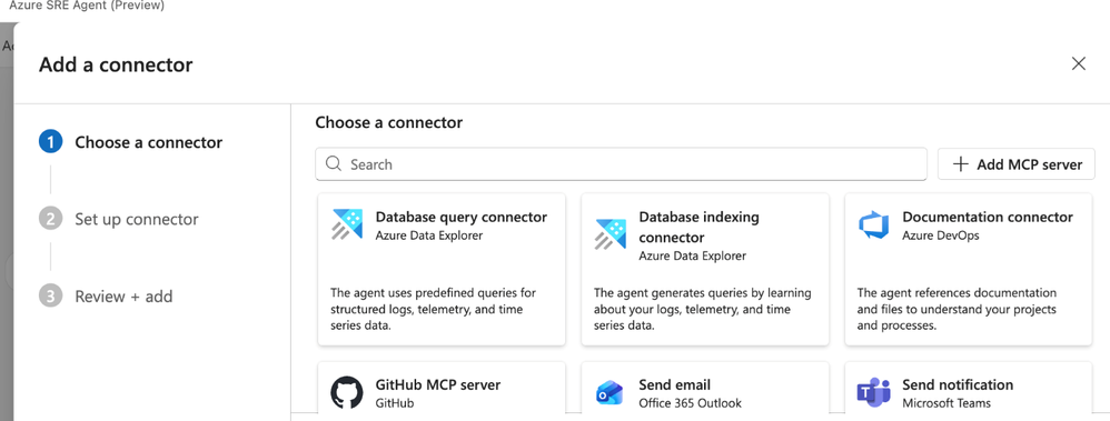 - Communication Notifications: The SRE Agent now features built-in connectors for Outlook, enabling automated email notifications, and for Microsoft Teams, allowing it to post messages directly to Teams channels for streamlined communication.