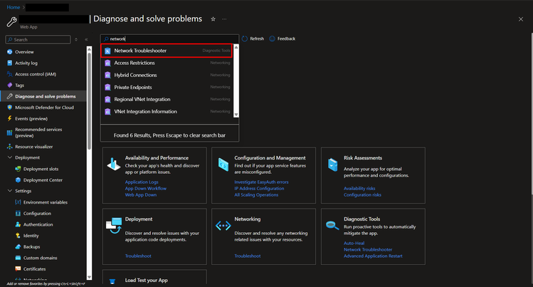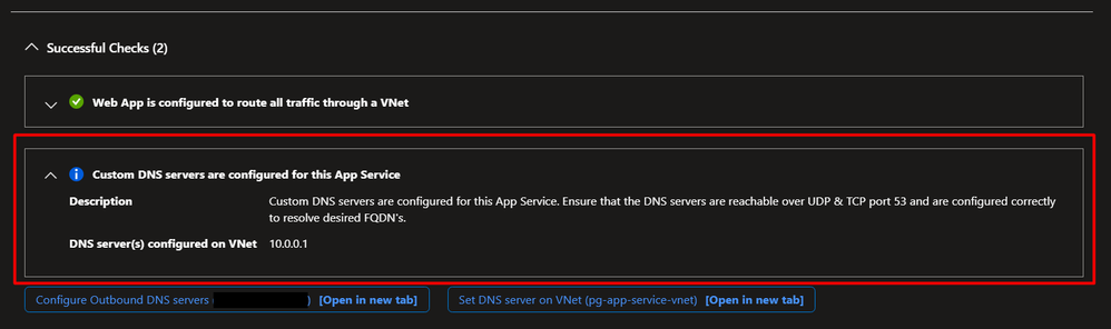 The Network Troubleshooter will also inform you if the Web App is using a custom DNS server, or Azure-provided DNS: