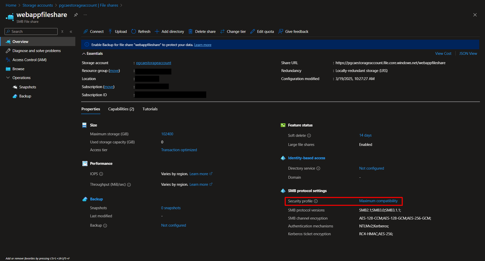 - When using an SMB file share, ensure that the Security Profile is set to Maximum compatibility: