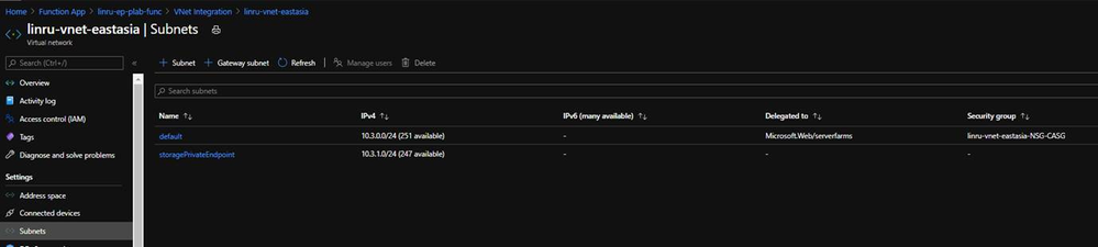Vnet: Needs to have two subnets, one is for function app, the other is for Private Endpoint for storage account