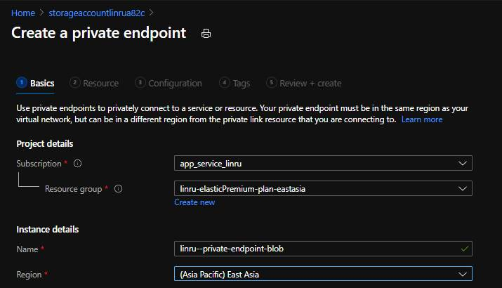 1. Create Function App on Elastic Premium plan, the binding storage account needs to be with pricing tier general purpose v2 or higher to support private endpoint. Both function app and storage account should be hosted in the same region for better performance.