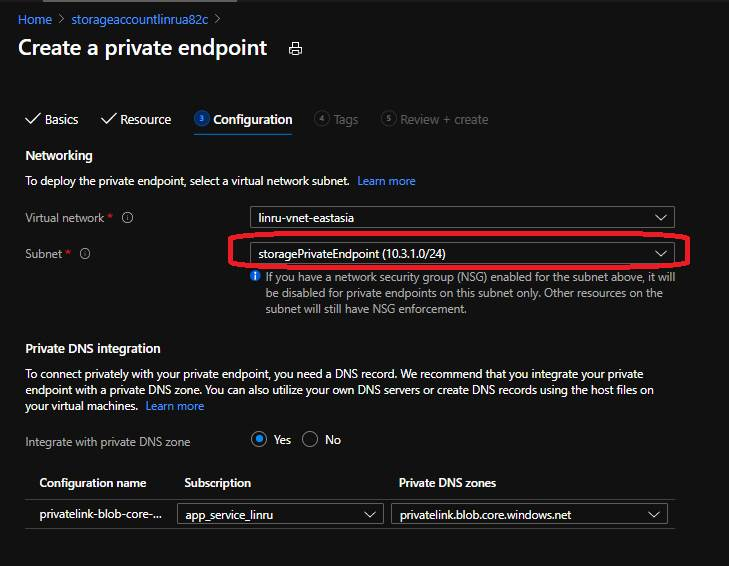 4.4 In configuration, select the vnet and subnet for private endpoints. Then review and create.