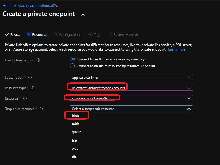 4.3 In the next page, choose storage account for “Resource type”, select the corresponding storage account, then select the target sub-source. For function apps, you need to provide private endpoint for file and blob. Click Next.