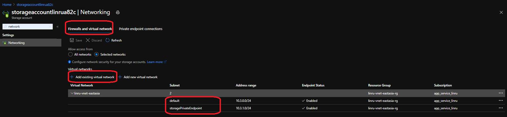 5. Set up firewall in storage account, blade “Networking” , allow access from existing two subnets of Vnet.