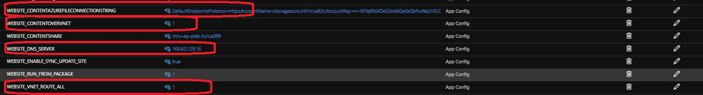 6. Something need to be caution here, we need to add corresponding app settings WEBSITE_CONTENTOVERVNET, WEBSITE_DNS_SERVER, and WEBSITE_VNET_ROUTE_ALL in order to make this feature work.