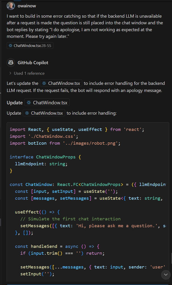 In this instance we will be creating a chatbot application to speak to the LLM. We will be creating a Microsoft Shopping agent that can process a web page and based on some specific user details recommend Microsoft Hardware to a customer. To do this we will need a frontend that allows a user to pass through a URL and a query for the specific ask from the customer. I'm sure much to the disappointment of my software engineering lecturers, my software development skills are very rusty. As a result I will be using GitHub Copilot to help me create this application. AI Apps to create AI Apps...