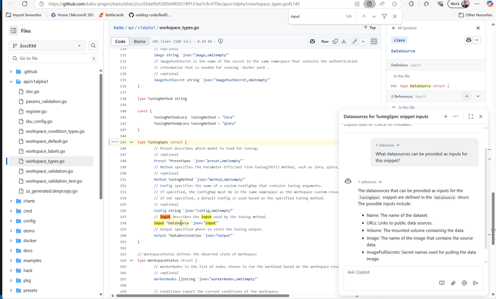 Very much on theme for this blog post when evaluating the creation of the KAITO tuning spec I leveraged GitHub Co-Pilot within the GitHub repository to assist in explaining the tuning spec parameters.