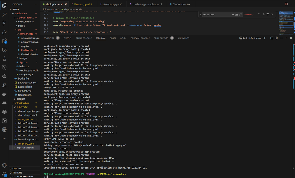 The screenshot above shows the KAITO specific commands in the bash script. We created the federated credential and restart the provisioner pods. We then use a very simple provided yaml to inform KAITO what model we want to deploy. We then loop to check when the workspace is ready. As we are using Karpenter/Node Auto Provisioner under the hood to manage the creation of the GPU nodes at the point the workspace resource is created on the cluster the GPU nodes will spin up and the (Falcon7b in this case) LLM image will be pulled. This can take up to an hour to complete so we loop to check whether the resource is ready yet.