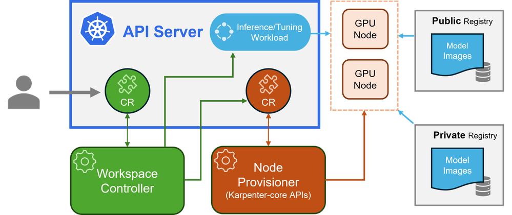 KAITO is an open-source project created by Microsoft, it stands for Kubernetes AI Toolchain Operator. KAITO automates the deployment and management of AI/ML model inference and tuning workloads within Kubernetes clusters. It streamlines the integration of large language models (LLMs) by managing model files as container images, providing preset configurations tailored to various GPU hardware, and supporting popular inference runtimes like vLLM and transformers. KAITO uses Custom Resource Definition's (CRD) and a controller design pattern that enables users to define a workspace custom resource. That resource specifies GPU requirements and inference or tuning parameters. The operator then automates the provisioning of GPU nodes and deployment of workloads based on these specifications, simplifying the process of running AI models on Kubernetes. KAITO supports popular open source models like Falcon and Phi.