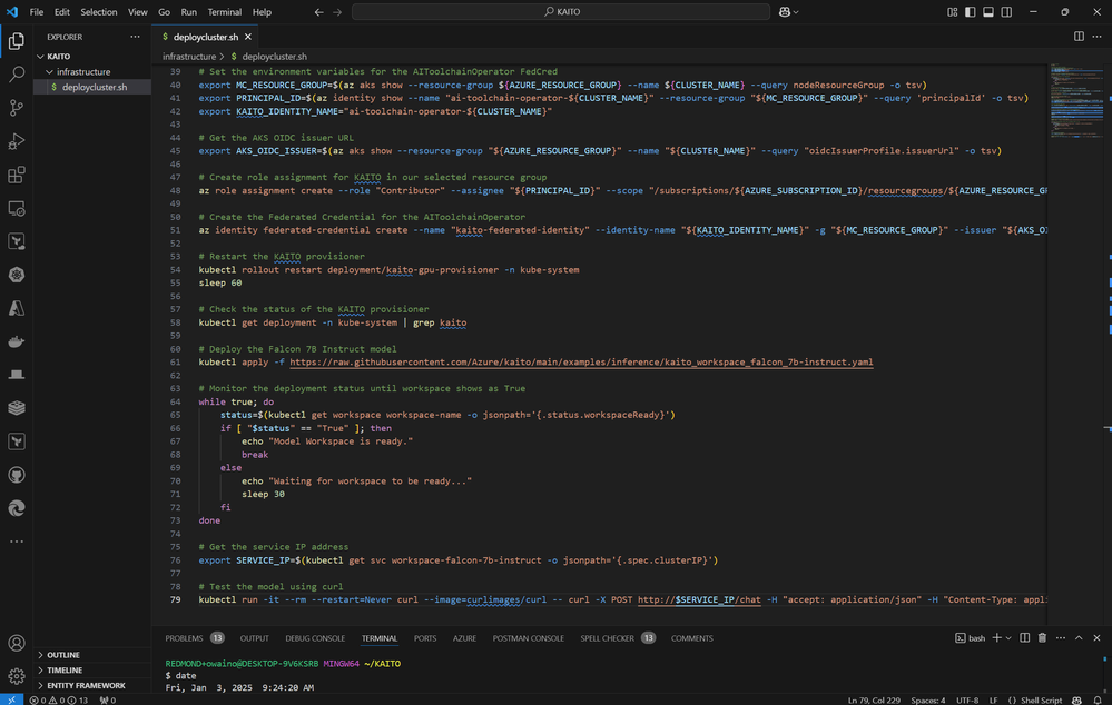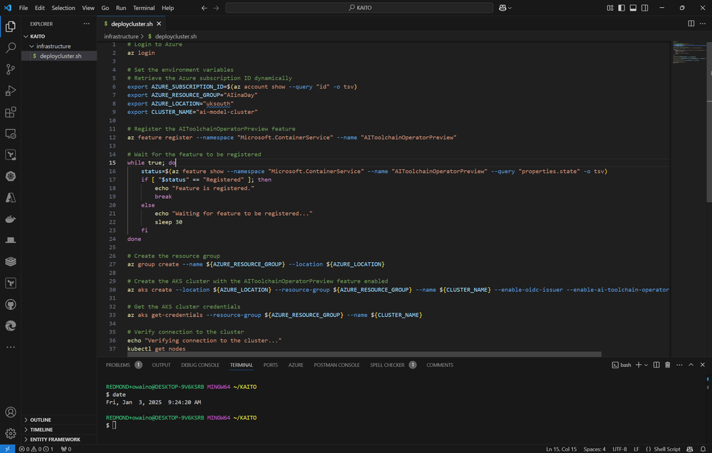 The bash script created above uses environment variables to register the KAITO feature flag, create the resource group, the AKS cluster and then verify connection to the cluster.