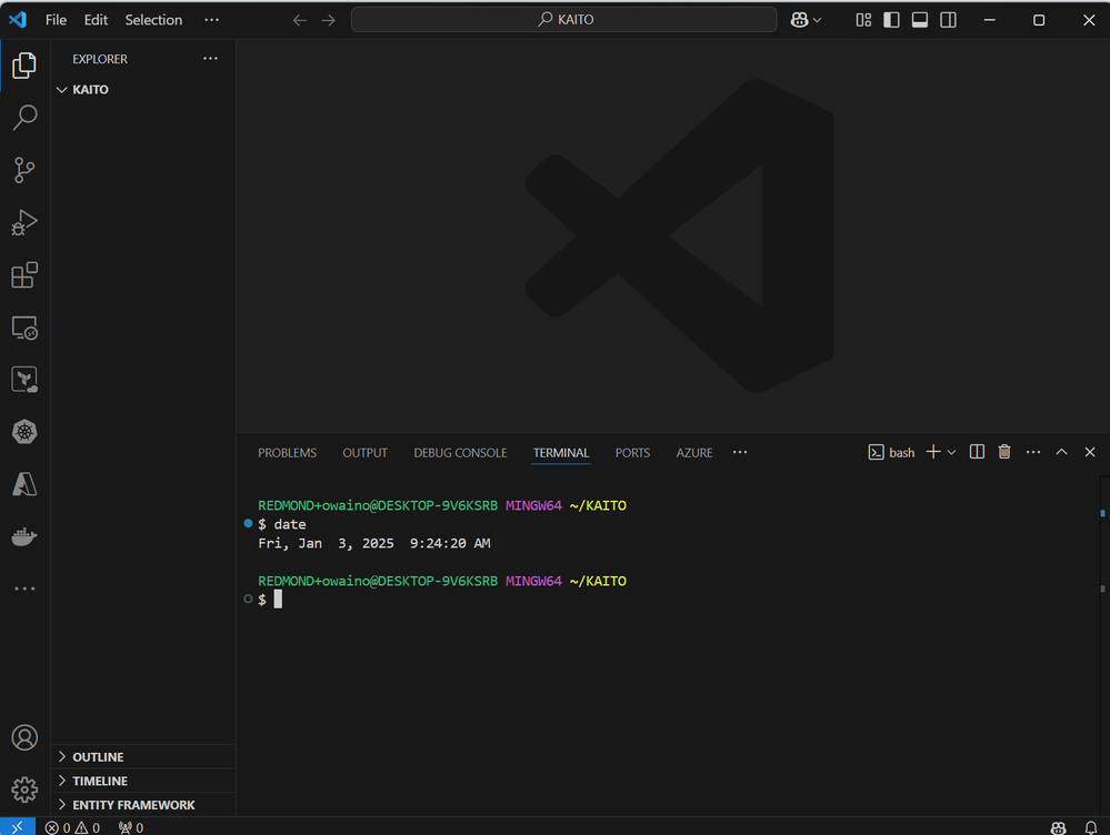 To start with I created a new project in VSCode in a new window. Note the date displayed in the terminal for posterity.