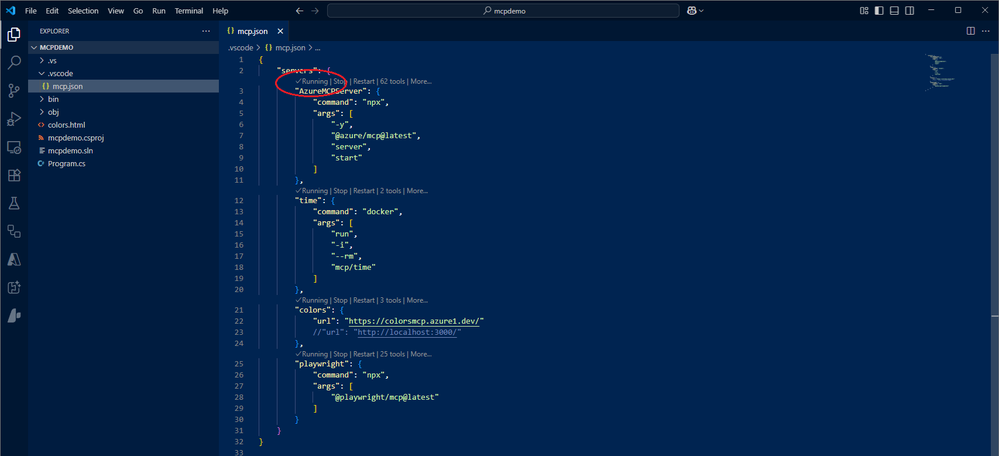 Each server will have a grey status line displayed in the mcp.json file. Ensure that each server shows a status of "Running" and that there are no errors present.