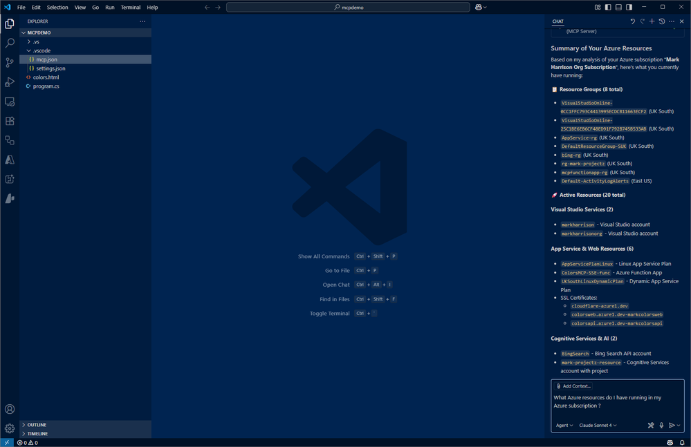 This section shows the use of several MCP tools - specifically, these will provide knowledge about Colors, Timer, Prices and Azure Resources.