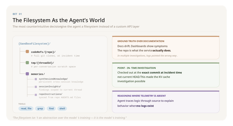 Everything it reasons over – source code, runbooks, query schemas, past investigation notes – is exposed as files. It interacts with that world using read_file, grep, find, and shell. No SearchCodebase API. No RetrieveMemory endpoint.