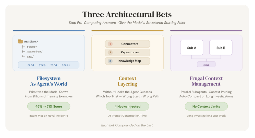 The inversion was simple but hard to accept: stop pre-computing the answer space. Give the model a structured starting point, a filesystem it knows how to navigate, context hooks that tell it what it can access, and budget management that keeps it sharp through long investigations.