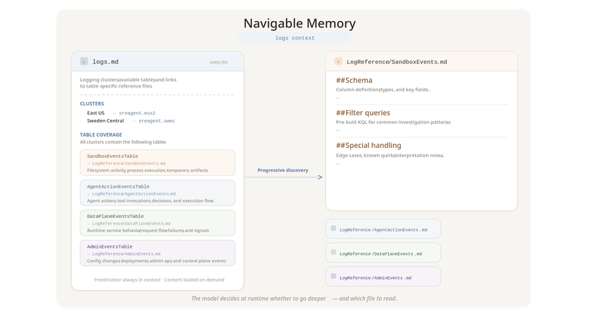 The answer is an agent that can discover what it needs as the investigation unfolds. In the KV cache incident, each step, from metric anomaly to deployment history to a specific diff, followed from what the previous step revealed. It was not a pre-scripted path. Navigating towards the right context with progressive discovery is key to creating deep agents which can handle novel scenarios.