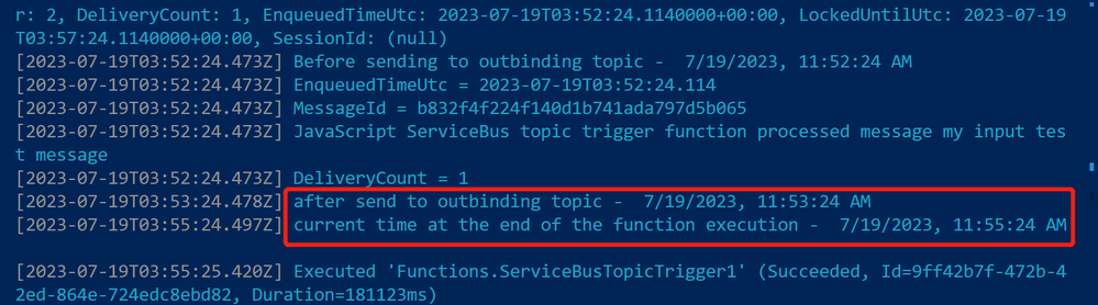 Then, we can check the message in the output binding Service Bus topic and find that the message enqueue time is 11:55 GTM+8, which means the message was sent after the code of function is totally executed.