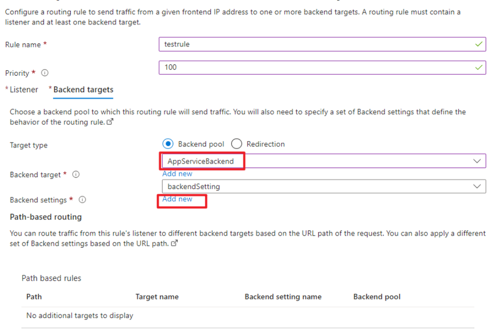 For backend targets, select the Backend Pool we created before and create new Backend Settings