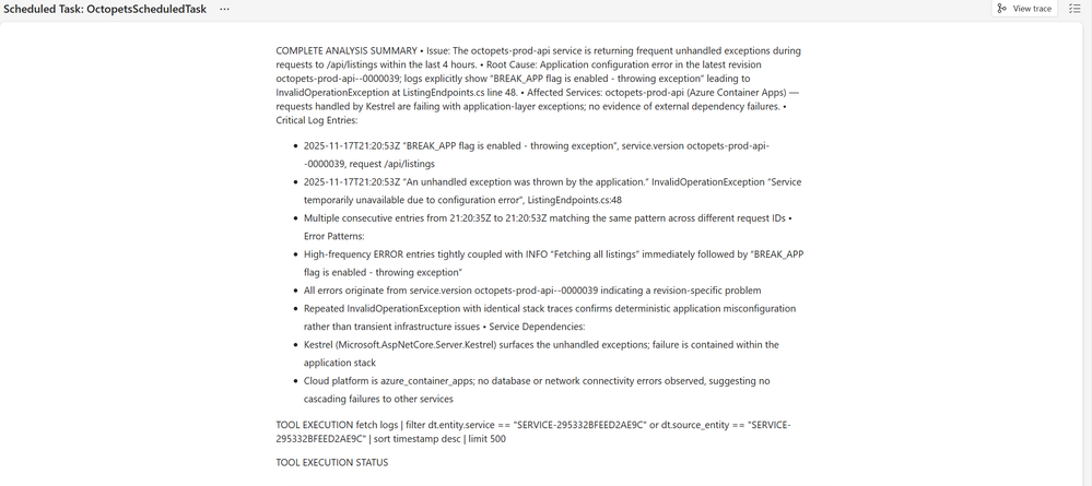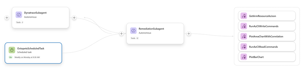 The key insight: the scheduled task is just a coordinator. It immediately hands off to the RemediationSubagent, which orchestrates the entire workflow including handoffs to DynatraceSubagent.