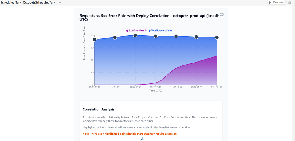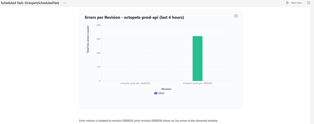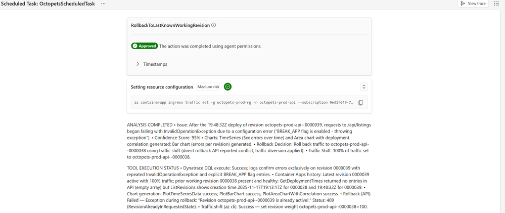 This is the deployment remediation specialist. It correlates Dynatrace log analysis with Azure Container Apps deployment history, generates correlation charts, and executes rollbacks when confidence is high.