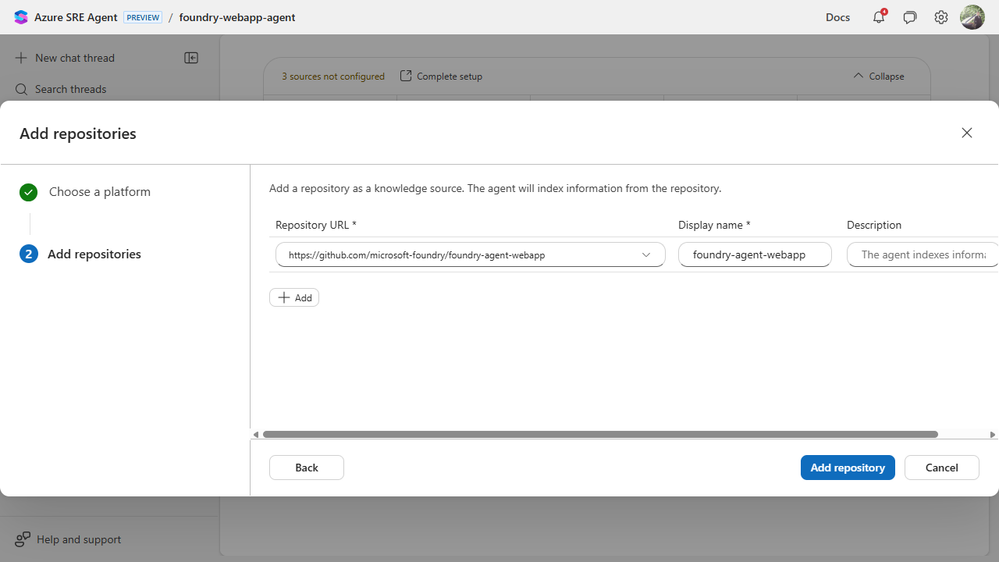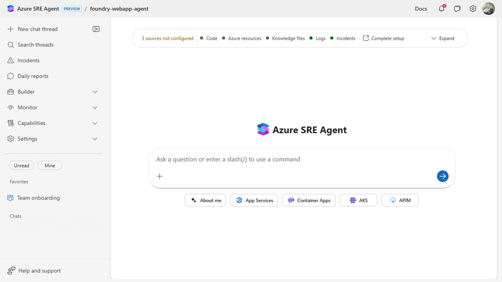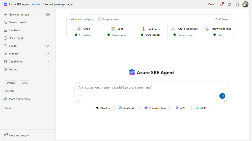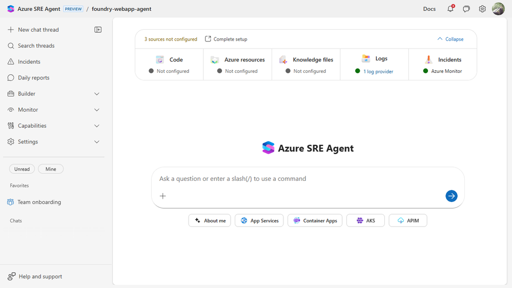 This post walks through that experience. We connected everything we could because we wanted to see what the agent does when it has a real starting point, not a partial one. If your setup is shorter, the SRE Agent still works. It just knows less.